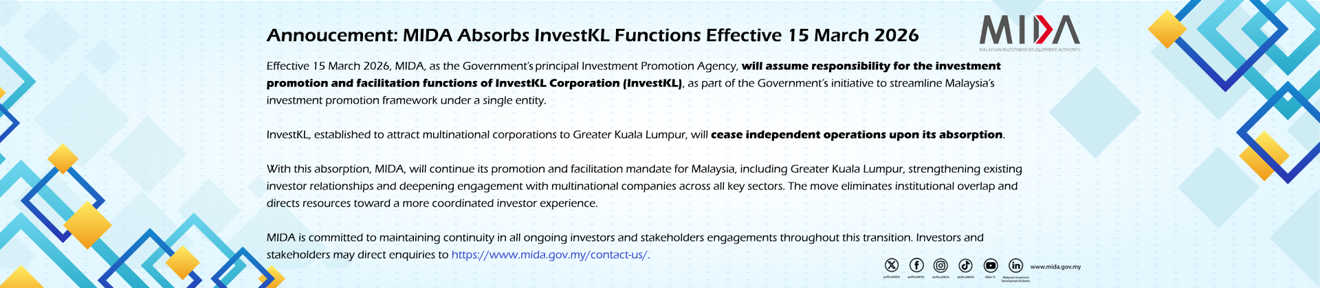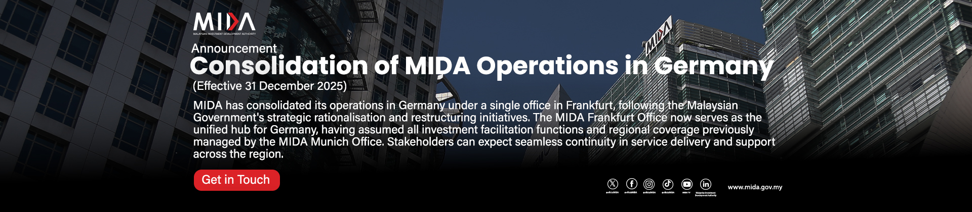 With over five decades of experience in nation-building, MIDA collaborates closely with investors to uncover investment prospects and ensure a smooth investment process in Malaysia. MIDA provides comprehensive support, guiding investors from their initial inquiries through to the successful realisation of their projects.