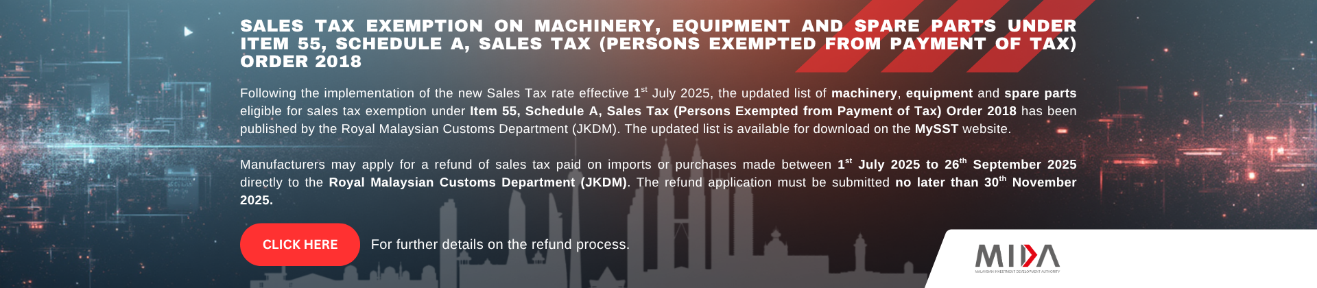 With over five decades of experience in nation-building, MIDA collaborates closely with investors to uncover investment prospects and ensure a smooth investment process in Malaysia. MIDA provides comprehensive support, guiding investors from their initial inquiries through to the successful realisation of their projects.