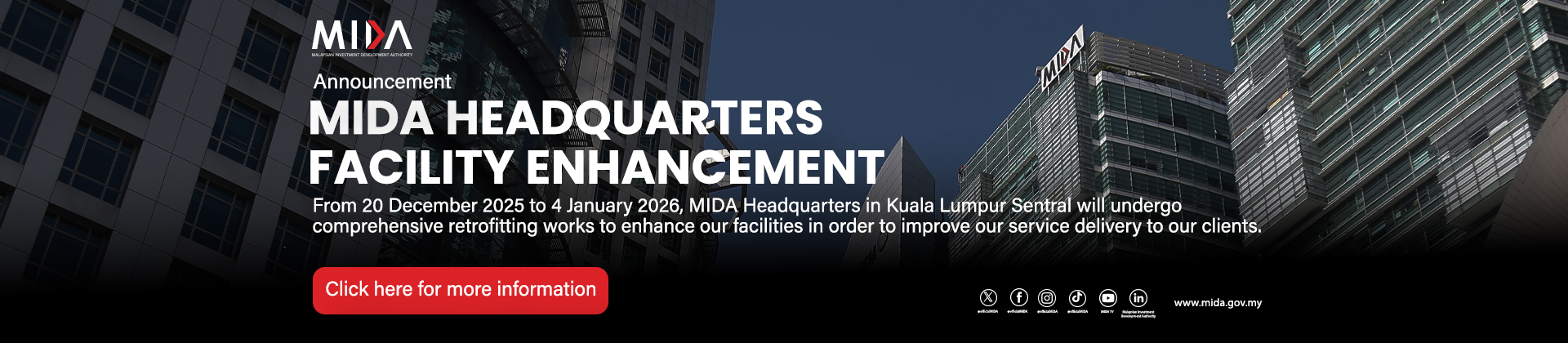 With over five decades of experience in nation-building, MIDA collaborates closely with investors to uncover investment prospects and ensure a smooth investment process in Malaysia. MIDA provides comprehensive support, guiding investors from their initial inquiries through to the successful realisation of their projects.