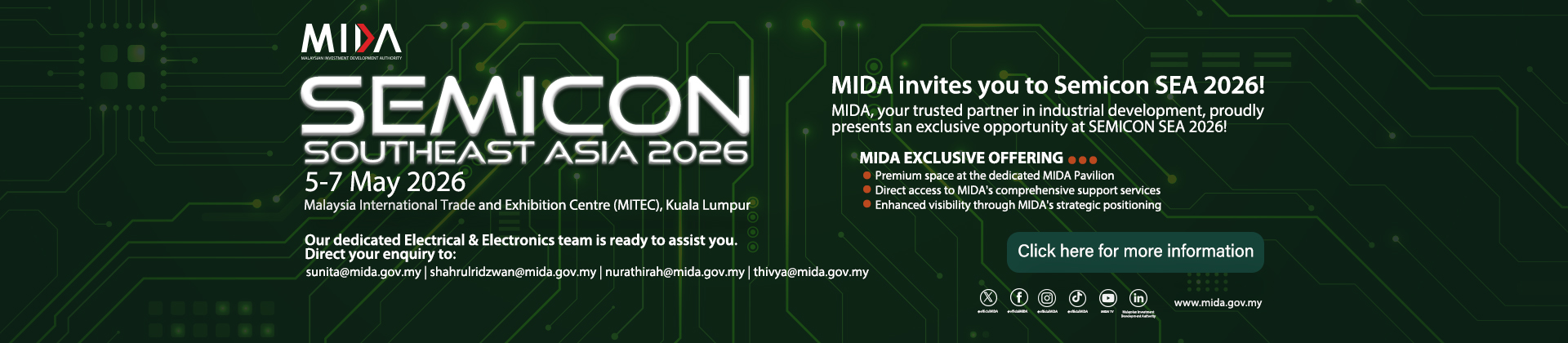 With over five decades of experience in nation-building, MIDA collaborates closely with investors to uncover investment prospects and ensure a smooth investment process in Malaysia. MIDA provides comprehensive support, guiding investors from their initial inquiries through to the successful realisation of their projects.
