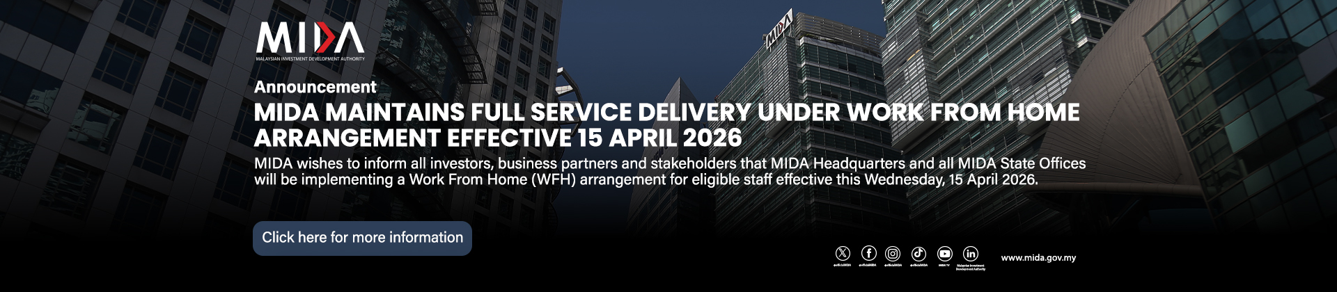 Mit mehr als 50 Jahren Erfahrung im Aufbau der malaysischen Industrie arbeitet MIDA Hand in Hand mit Investoren, um Investitionsmöglichkeiten zu erschließen und eine nahtlose Investition in Malaysia zu ermöglichen. MIDA begleitet Investoren von ihren ersten Anfragen bis zur Realisierung ihrer Projekte.