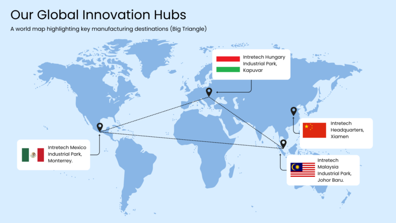 Intretech’s decision to establish its operations in Malaysia forms a key pillar of its “Big Triangle” global strategy – a framework designed to create a balanced, resilient manufacturing network across Asia, Europe, and the Americas.