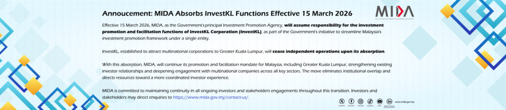 Effective 15 March 2026, MIDA, as the Government’s principal Investment Promotion Agency will assume responsibility for the investment promotion and facilitation functions of InvestKL Corporation (InvestKL), as part of the Government’s initiative to streamline Malaysia’s investment promotion framework under a single entity.